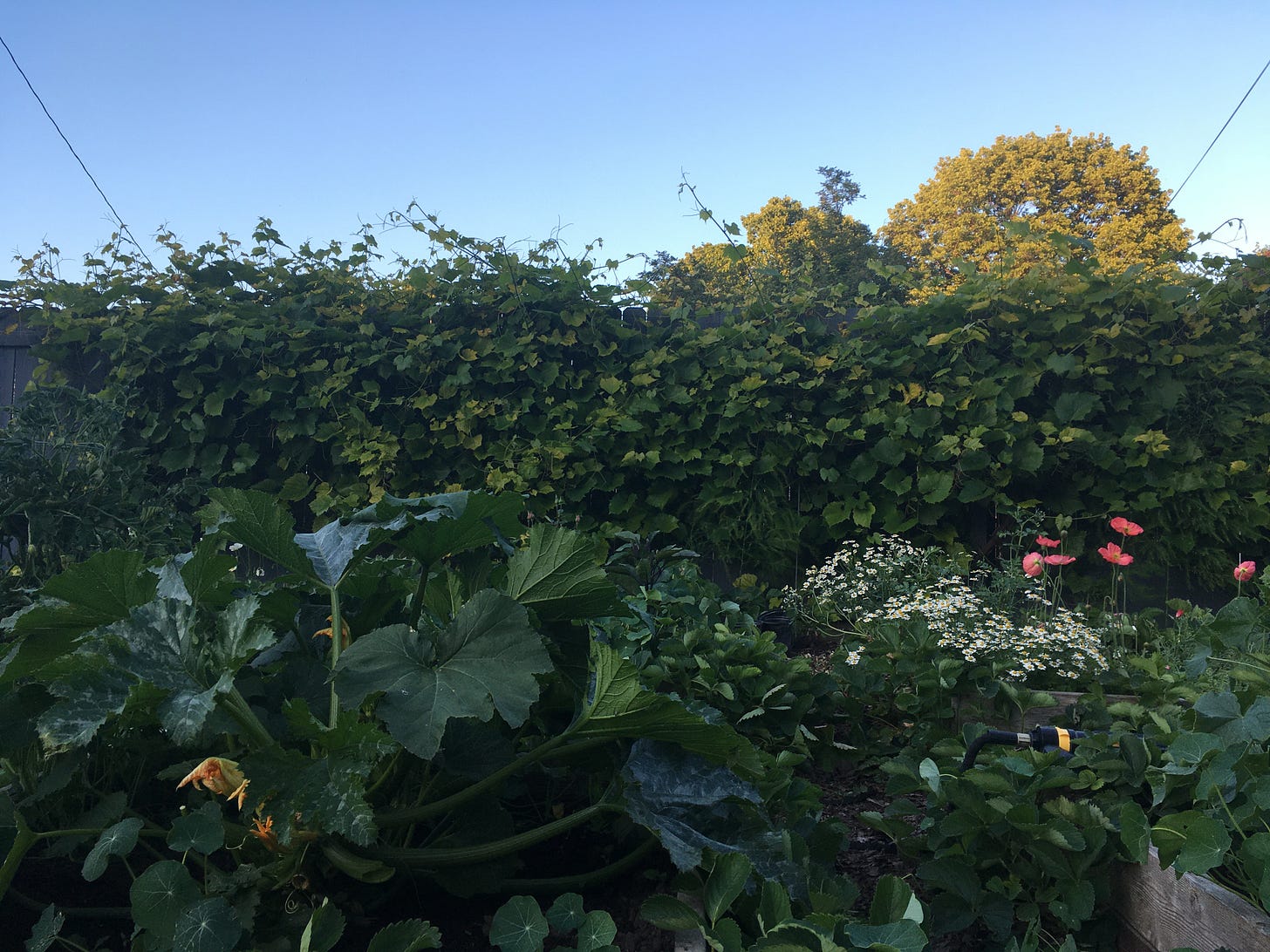 golden hour walks under trees past flowers and backyard vegetable gardens